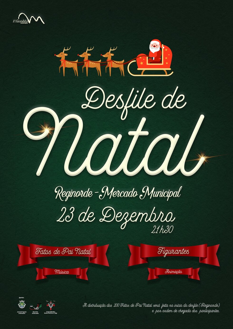 Num percurso desde a Reginorde até ao Mercado Municipal, desfile pelas ruas da cidade de Mirandela. Temos 200 fatos de Pai Natal para oferecer!