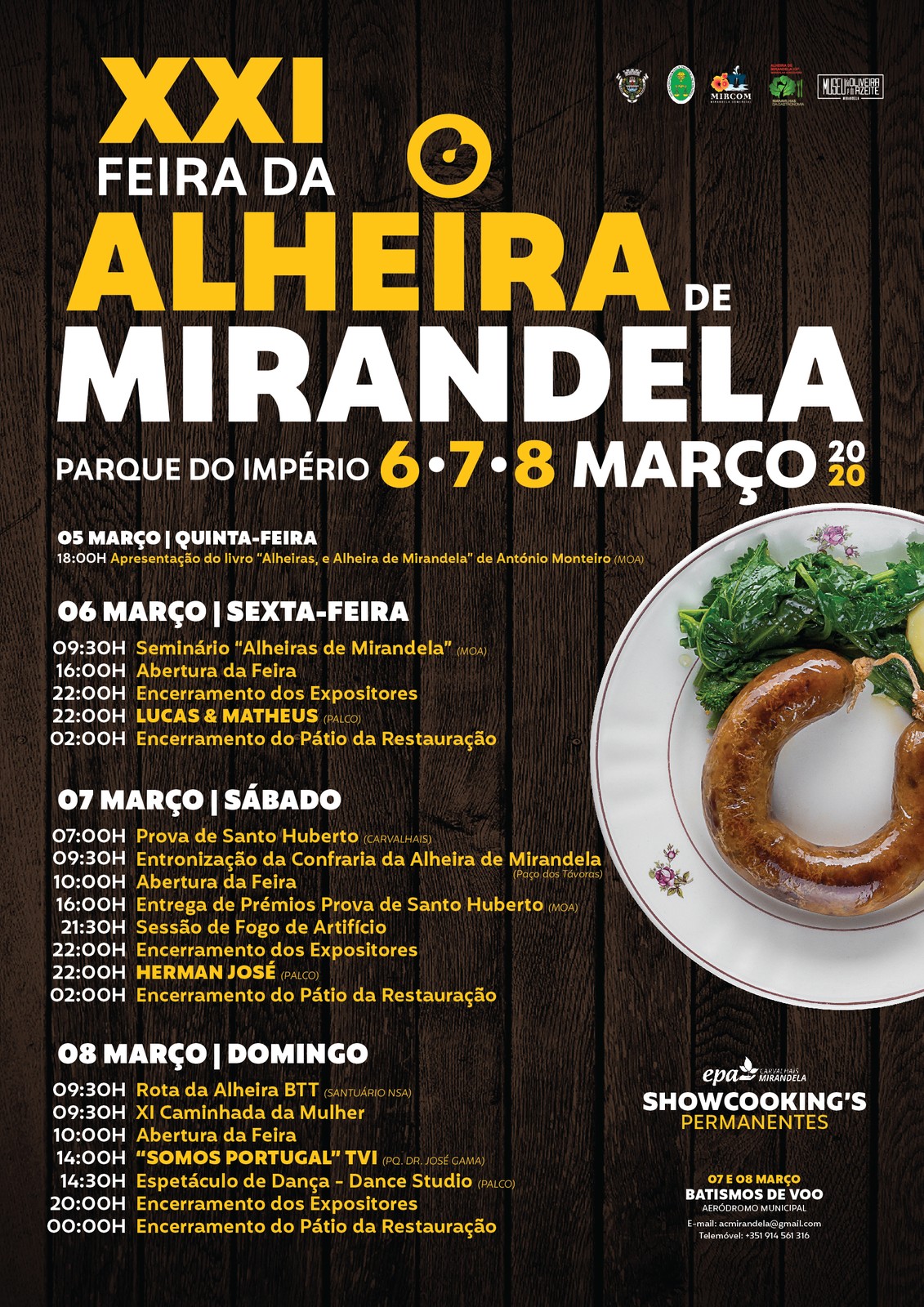 A cidade de Mirandela está pronta para receber a maior feira da região. Entre 6 a 8 de março de 2020, o Parque do Império é transformado num autêntico mercado onde a Alheira é o centro das atenções. Com um número recorde de 93 expositores, mais 11 face ao anterior, restauração e muita animação farão parte da XXI edição da Feira da Alheira de Mirandela. Não perca!