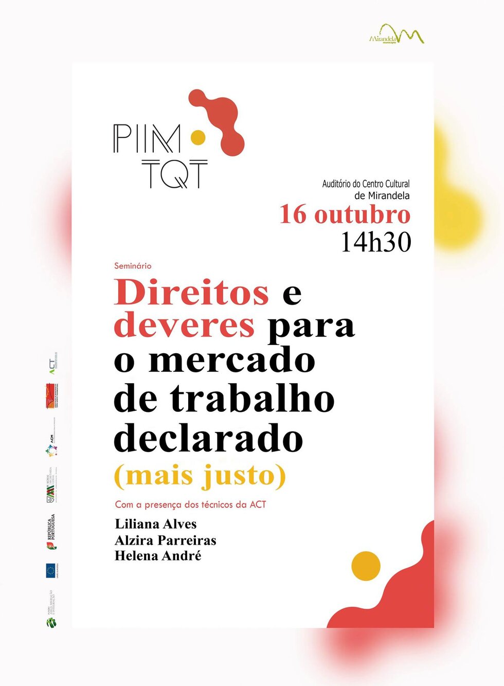 Participe no Seminário "Direitos e deveres dos trabalhadores/as VS Entidades empregadoras", a realizar no dia 16 de outubro, das 14h00 às 17h30, no Auditório Municipal, que contará com a presença de técnicos/as da Autoridade para as Condições do Trabalho (ACT).