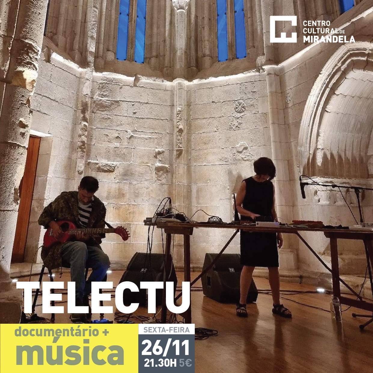 O concerto com Vítor Rua (guitarra, membro da formação original dos Telectu) e Ilda Teresa de Castro (sintetizador e metalofone) acontece em Mirandela, no Grande Auditório do Centro Cultural, pelas 21:30h.