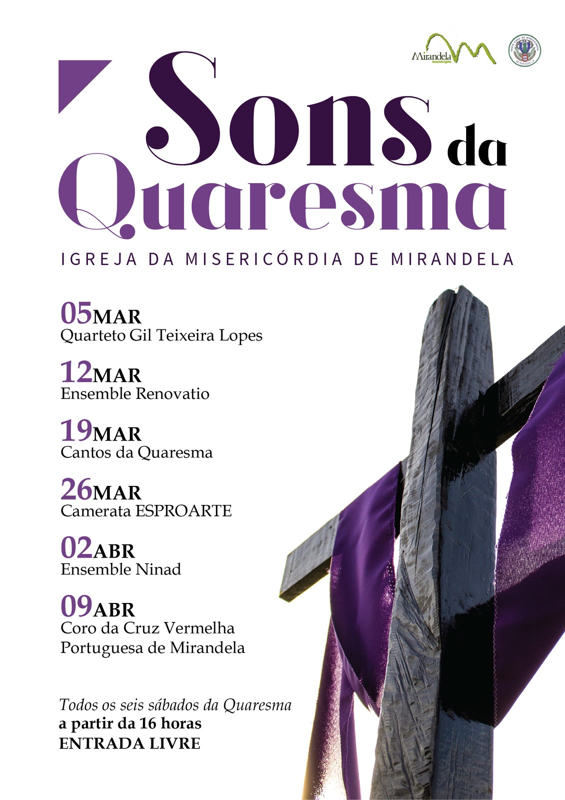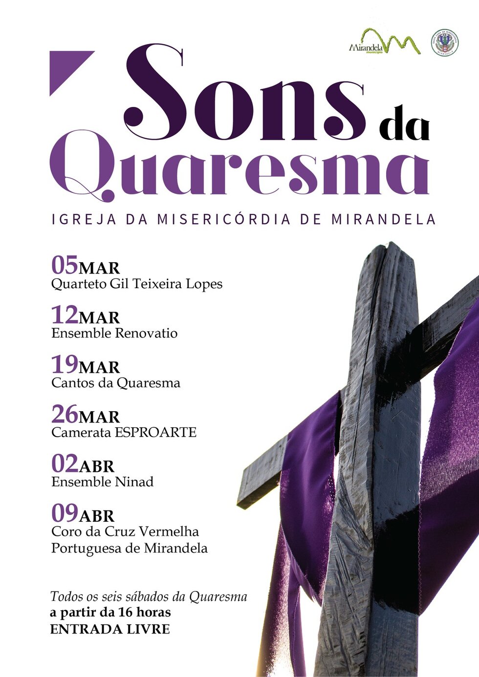 Ao longo dos seis sábados da Quaresma, o ciclo “Sons da Quaresma” animará as tardes da cidade, levando à Igreja da Misericórdia de Mirandela, através de um conjunto de grupos e ensembles, a experiência do cântico gregoriano, da polifonia portuguesa, da música barroca, mas também dos sons tradicionais portugueses associados à época da Quaresma e da Páscoa.