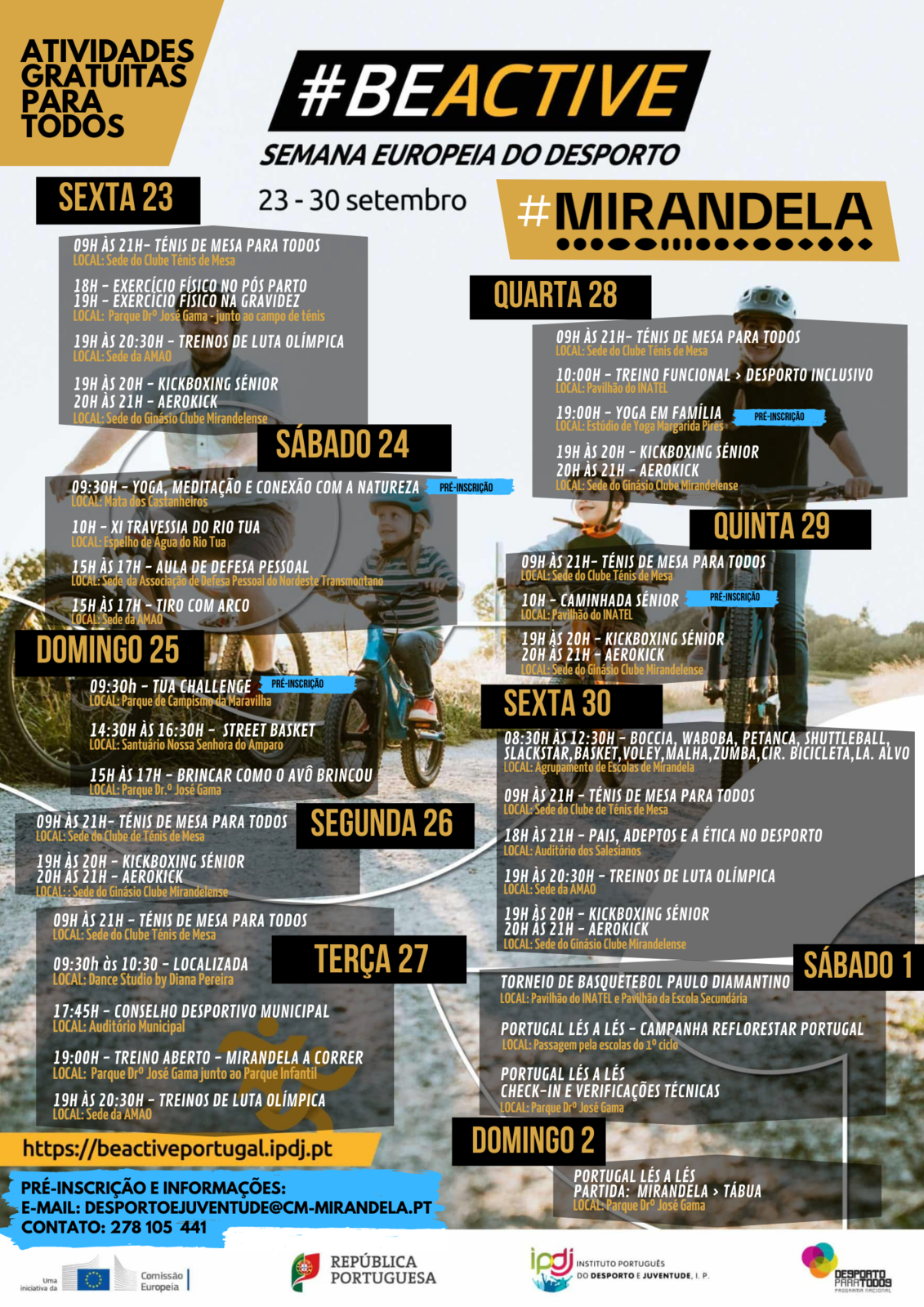 Com o lema #BEACTIVE, entre os dias 23 e 30 de setembro, a Câmara Municipal e várias entidades mirandelenses irão disponibilizar um conjunto de atividades desportivas gratuitas com objetivo incentivar a prática desportiva e consequente melhoria de qualidade de vida da população.