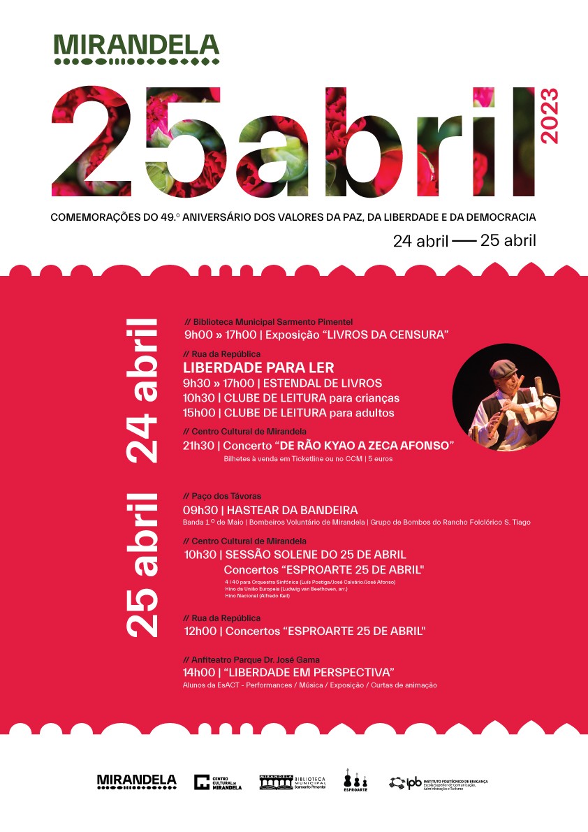 No âmbito do 49.º aniversário do dia em que os valores da paz, da liberdade e da democracia marcaram o rumo de Portugal, a Câmara Municipal de Mirandela, em parceria com várias entidades do concelho, assinala as comemorações do 25 de Abril de 2023 com concertos, sessões solenes e diversos momentos culturais.