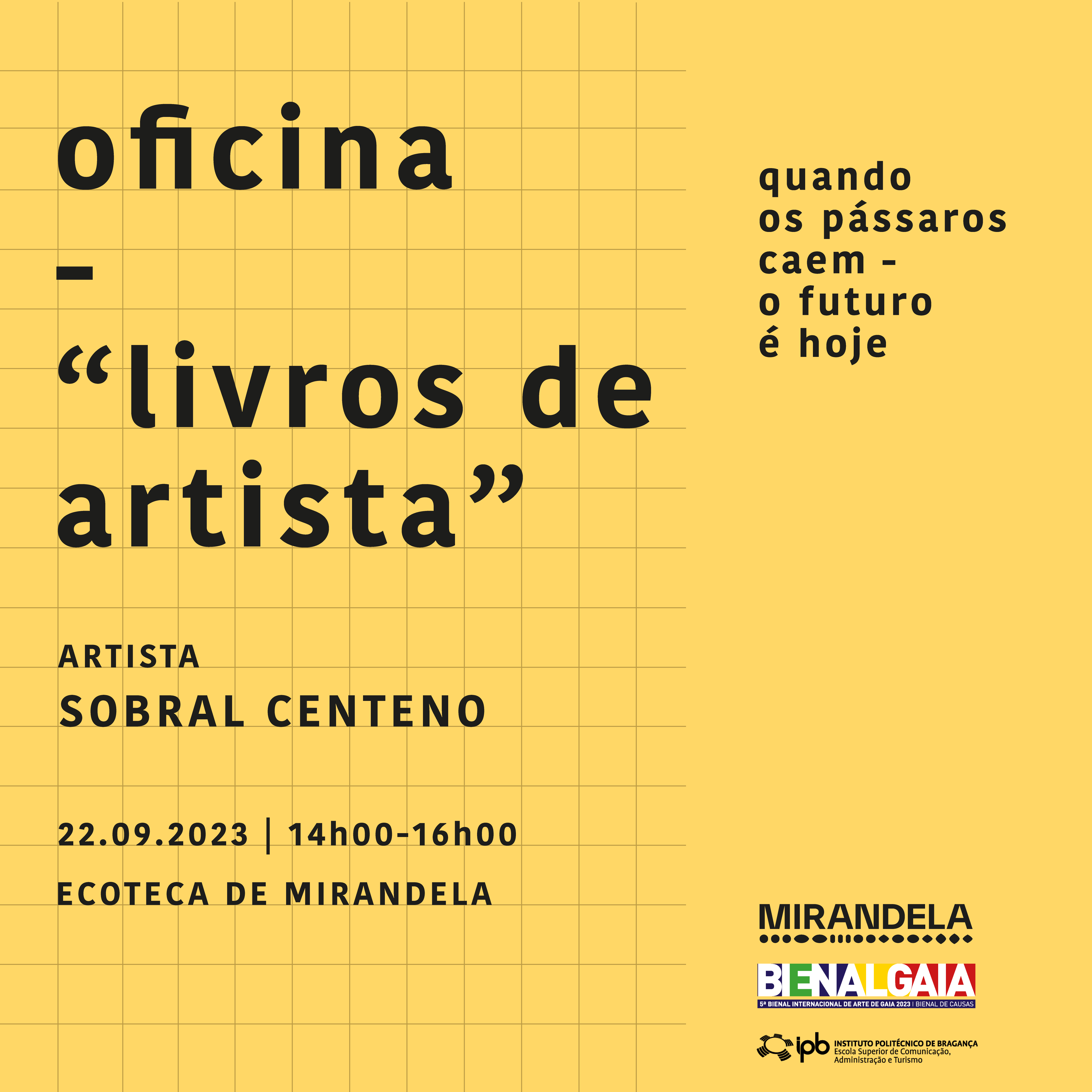 A segunda oficina de artes plásticas, do projeto cultural "quando os pássaros caem - o futuro é hoje", dinamizada por Sobral Centeno, oferece um delicioso momento de aprendizagem e de troca de saberes sobre a conceção, preparação e realização de livros de artista. O livro, enquanto objeto de arte, será o estímulo para a criatividade.