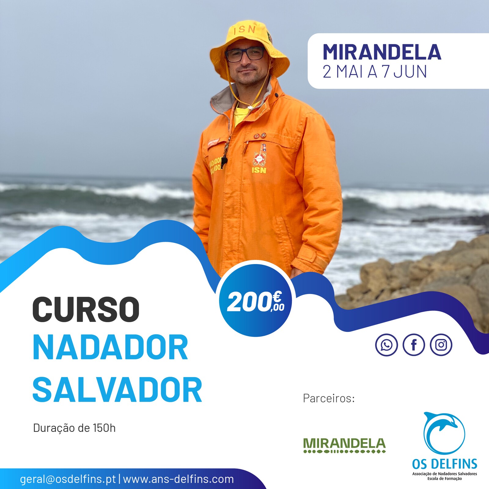 Promovido pela Associação de Nadadores-Salvadores - Os Delfins, o curso de nadador salvador decorrerá na cidade de Mirandela, entre os dias 02 de maio e 07 de junho de 2024. Os detentores desta formação específica, necessária para a execução de funções profissionais, poderão vir a integrar a bolsa de nadadores salvadores para a época balnear de 2023.