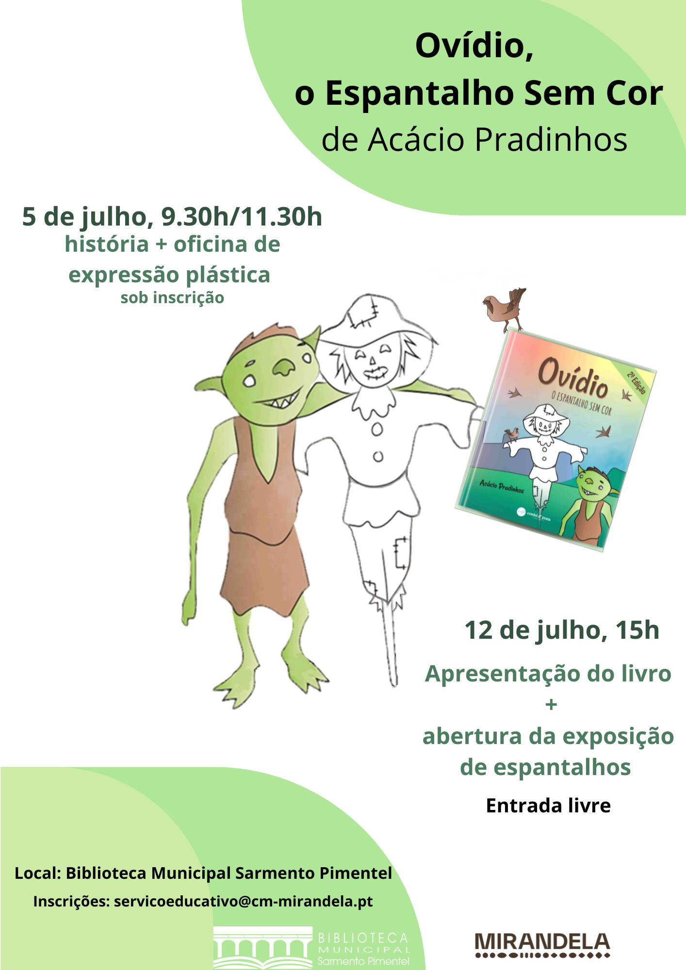 "Ovídio, o Espantalho Sem Cor", é um conto que o autor, Acácio Pradinhos, irá contar para, de seguida, orientar uma oficina criativa de transformação de espantalhos.