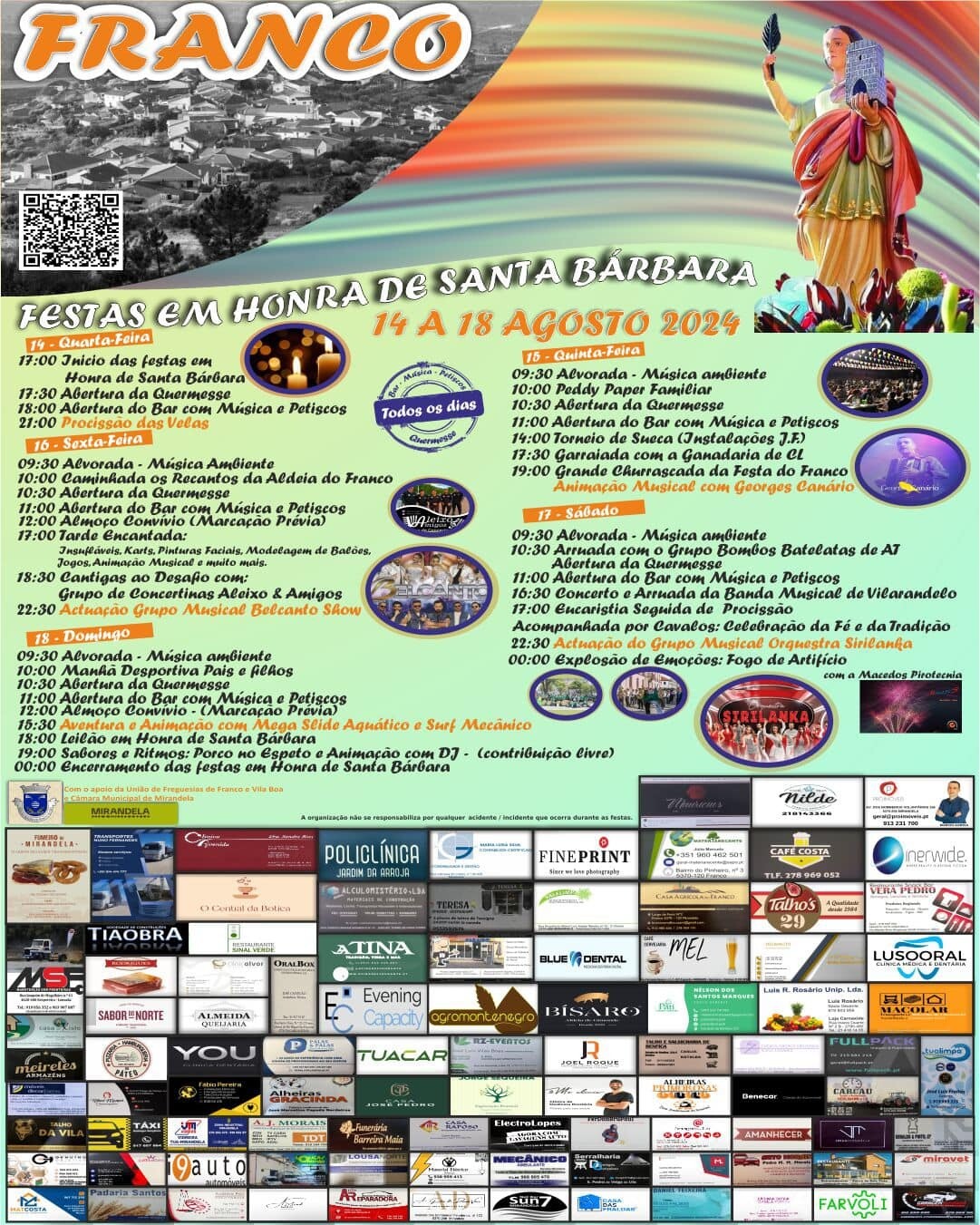 A Comissão de Festas do Franco tem o orgulho de apresentar o cartaz das Festas em Honra de Santa Bárbara, que se realizam de 14 a 18 de agosto de 2024 na Aldeia do Franco ! 🎉