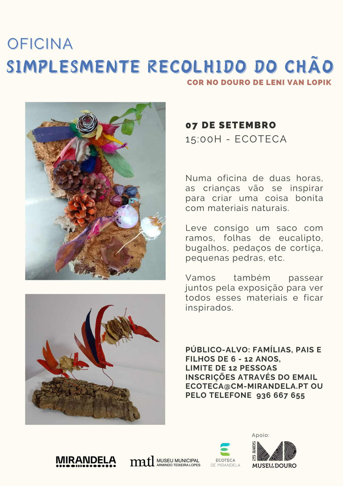 Durante a manhã serão recebidas as crianças do CNE Agrupamento 478 Mirandela, numa oficina de duas horas. À tarde será a vez dos pais trabalharem com os seus filhos, para criar uma peça bonita com materiais naturais. Leve consigo um saco com ramos, folhas de eucalipto, bugalhos, pedaços de cortiça, pequenas pedras, etc.
