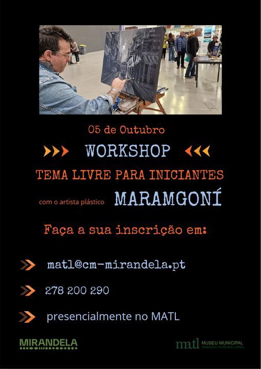 Para além de recebermos novas telas na sala de exposições temporárias, o artista plástico irá dinamizar 2 oficinas de arte para iniciantes, uma às 10h30 e outra às 15h00, onde irá explicar tudo sobre as técnicas de pintura.