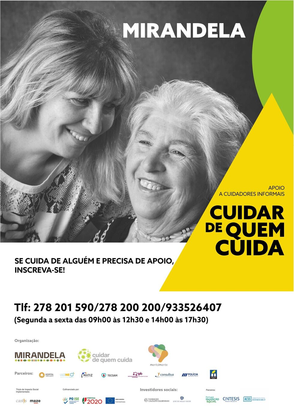 "Cuidar de Quem Cuida" mantêm-se abertas as inscrições para o grupo Psicoeducativo "Cuidar de Quem Cuida" para Cuidadores Informais, uma vez por semana, durante sensivelmente dois meses, Cuidadores Informais tem a oportunidade de fazer parte de um grupo Psicoeducativo, onde uma equipa multidisciplinar dá “formação” e apoio a estes cuidadores, com o intuito de capacitá-los para as necessidades do seu dia a dia, bem como estratégias de comunicação, e auto cuidado. A participação é gratuita.