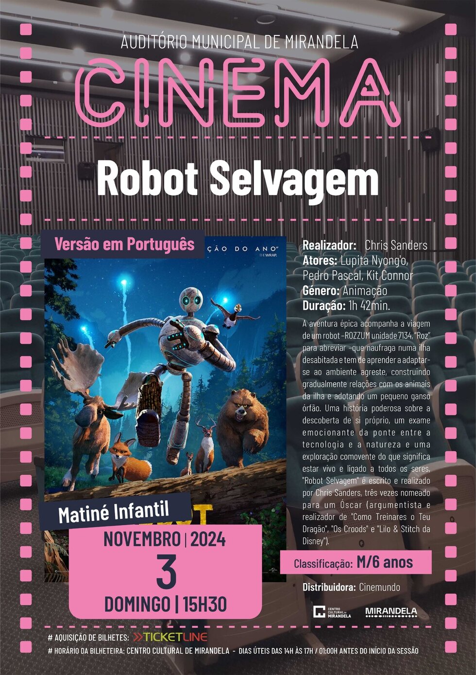 "Robot Selvagem" conta a história de Roz, um robot que naufraga numa ilha desabitada e aprende a viver entre os adoráveis animais que a habitam. Ao longo da sua aventura, Roz faz amigos inesperados, incluindo um pequeno ganso órfão, e descobre o valor da amizade e da natureza. Este filme encantador é uma emocionante jornada de autodescoberta que ensina a importância de cuidar do mundo à nossa volta.