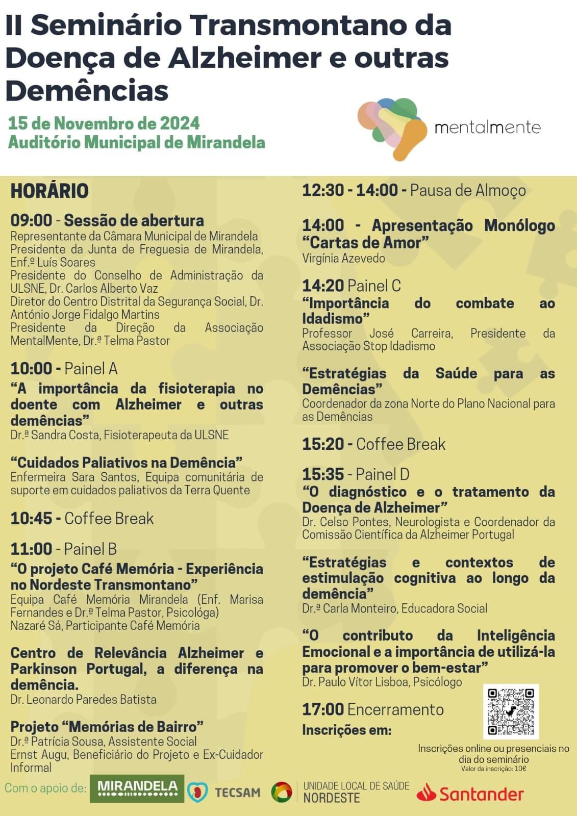 O II Seminário Transmontano da Doença de Alzheimer e Outras Demências ocorrerá no dia 15 de novembro de 2024, no Auditório Municipal de Mirandela. Este evento é organizado pela Associação "Mentalmente" e contará com diversas palestras e painéis que abordam temas como fisioterapia, cuidados paliativos, estimulação cognitiva, e estratégias de saúde para pessoas com Alzheimer e outras demências.