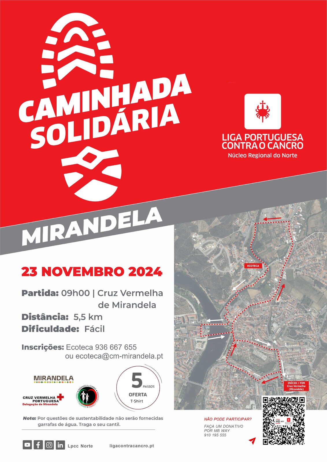 O Setor da Saúde do Município de Mirandela em parceria com a Cruz Vermelha Portuguesa - Delegação de Mirandela e a Associação Mirandela a Correr, unem-se nesta causa com a organização de uma caminhada que reverte a favor da Liga Portuguesa Contra o Cancro.