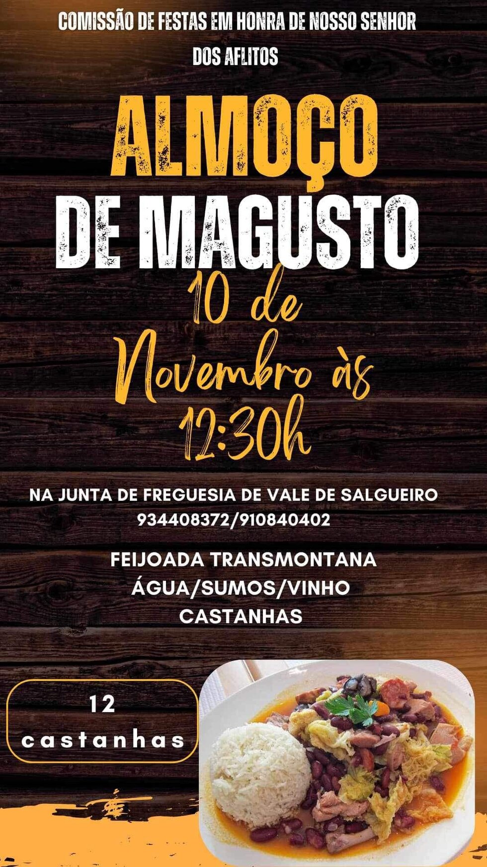 O Almoço de Magusto em Vale de Salgueiro terá lugar no dia 10 de novembro, às 12h30, organizado pela Comissão de Festas em Honra de Nosso Senhor dos Aflitos. O encontro será na Junta de Freguesia de Vale de Salgueiro e o menu inclui uma Feijoada Transmontana, acompanhada de água, sumos, vinho, e, como não podiam faltar, castanhas.