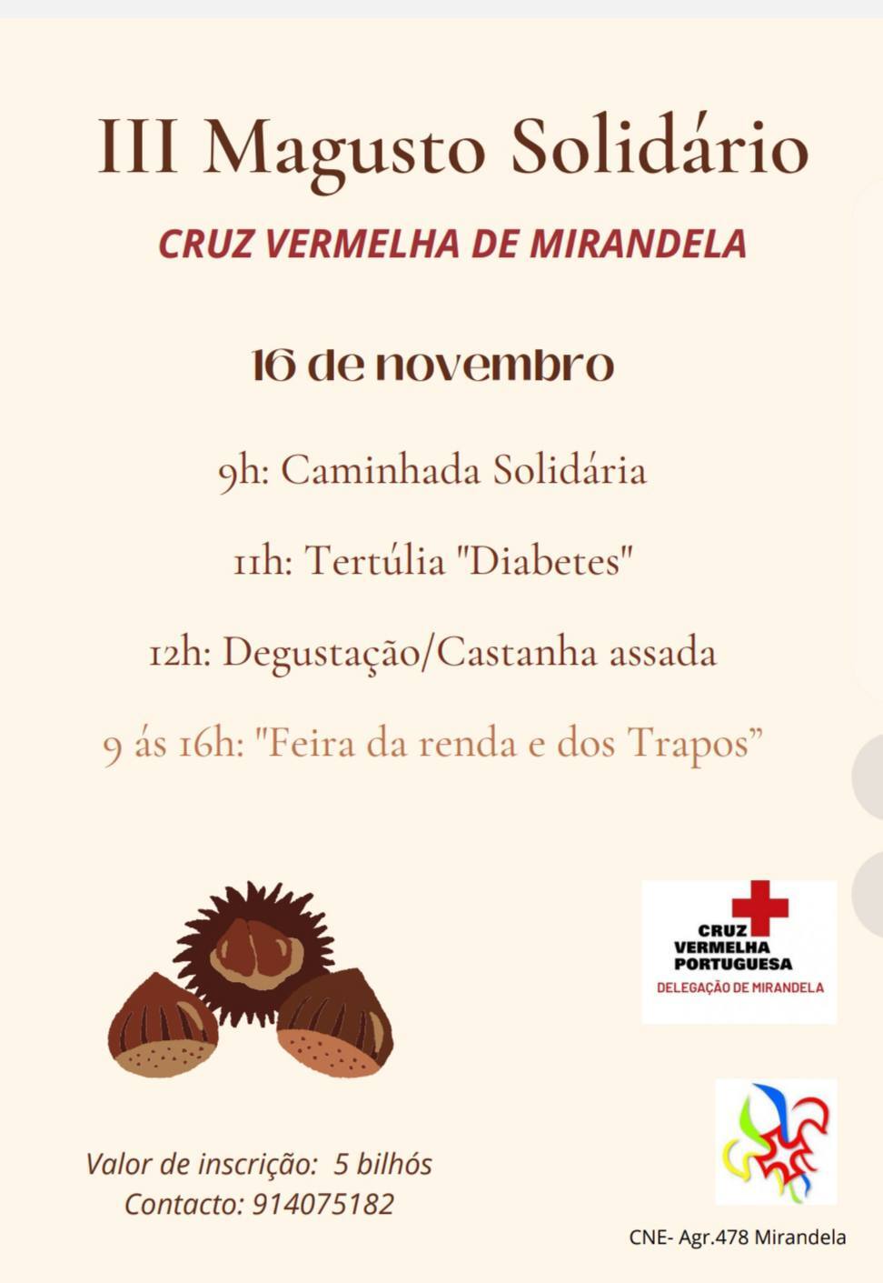 A Cruz Vermelha de Mirandela, em colaboração com o CNE-Agr. 478, convida a comunidade a participar no III Magusto Solidário.