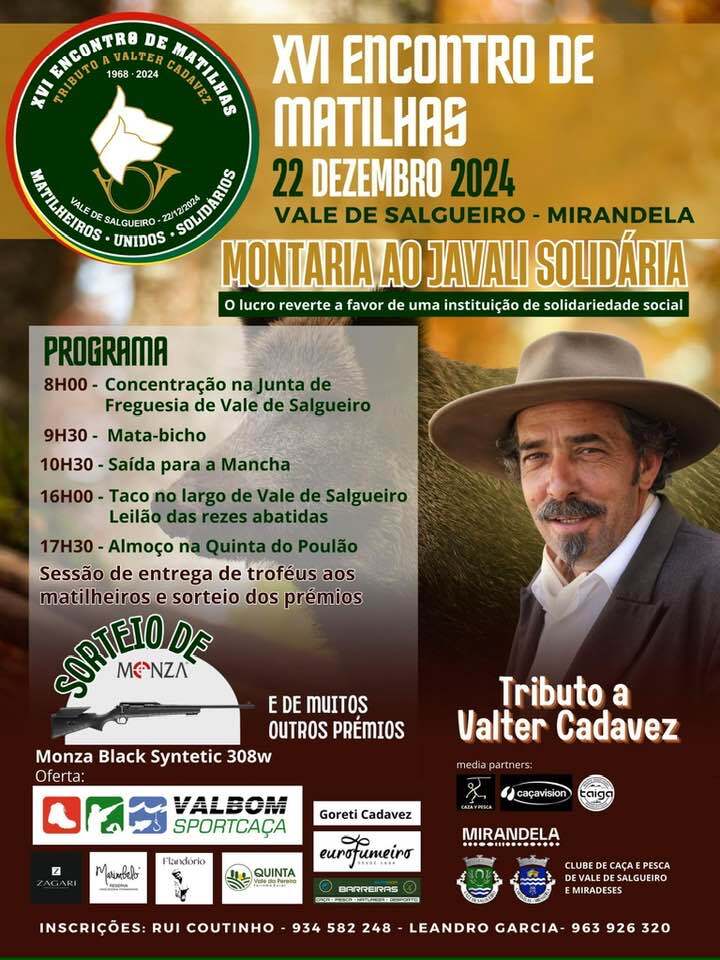 No próximo dia 22 de dezembro de 2024, a comunidade de matilheiros e entusiastas da montaria reúne-se para o XVI Encontro de Matilhas, uma edição especial dedicada ao eterno amigo e mentor Valter Cadavez (Matilha Búfalo Bill), que nos deixou recentemente. O evento terá lugar em Vale de Salgueiro, no concelho de Mirandela, terra natal de Valter. Este encontro é um tributo a um homem que dedicou a sua vida à defesa e promoção das matilhas, dos matilheiros e da montaria em Portugal.