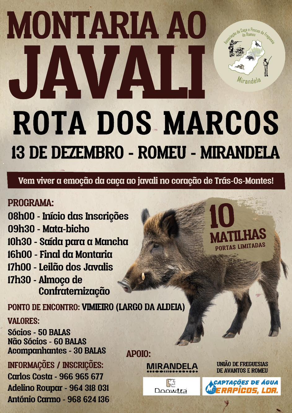 A Associação de Caça e Pescas da Freguesia do Romeu promove a Montaria ao Javali – Rota dos Marcos, em Romeu.