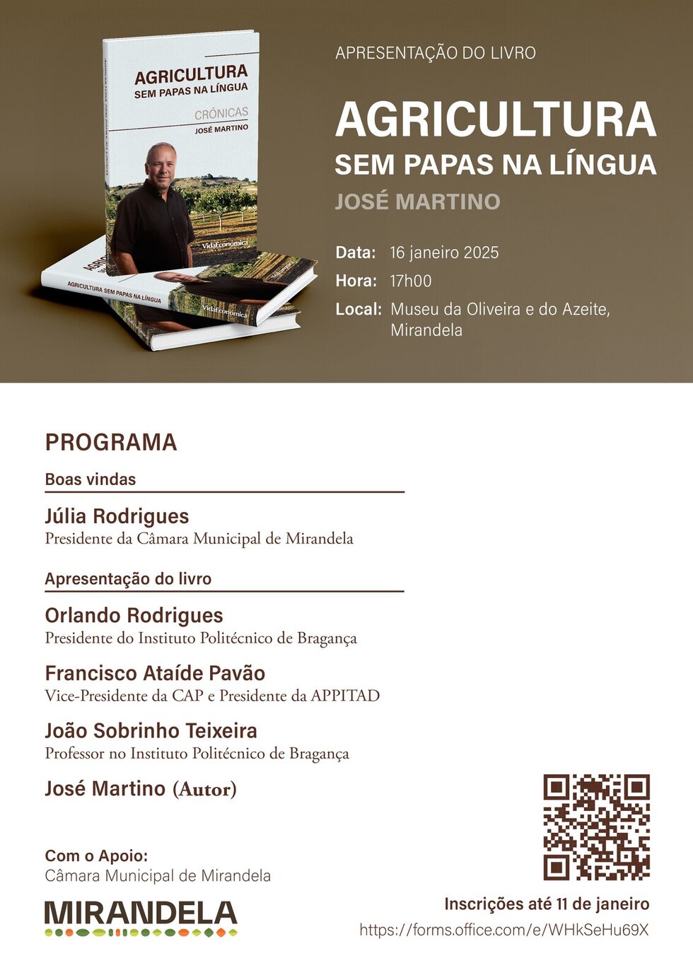 No dia 16 de janeiro, pelas 17h00, o Museu da Oliveira e do Azeite, em Mirandela, recebe a apresentação do livro "Agricultura: sem Papas na Língua", da autoria de José Martino.