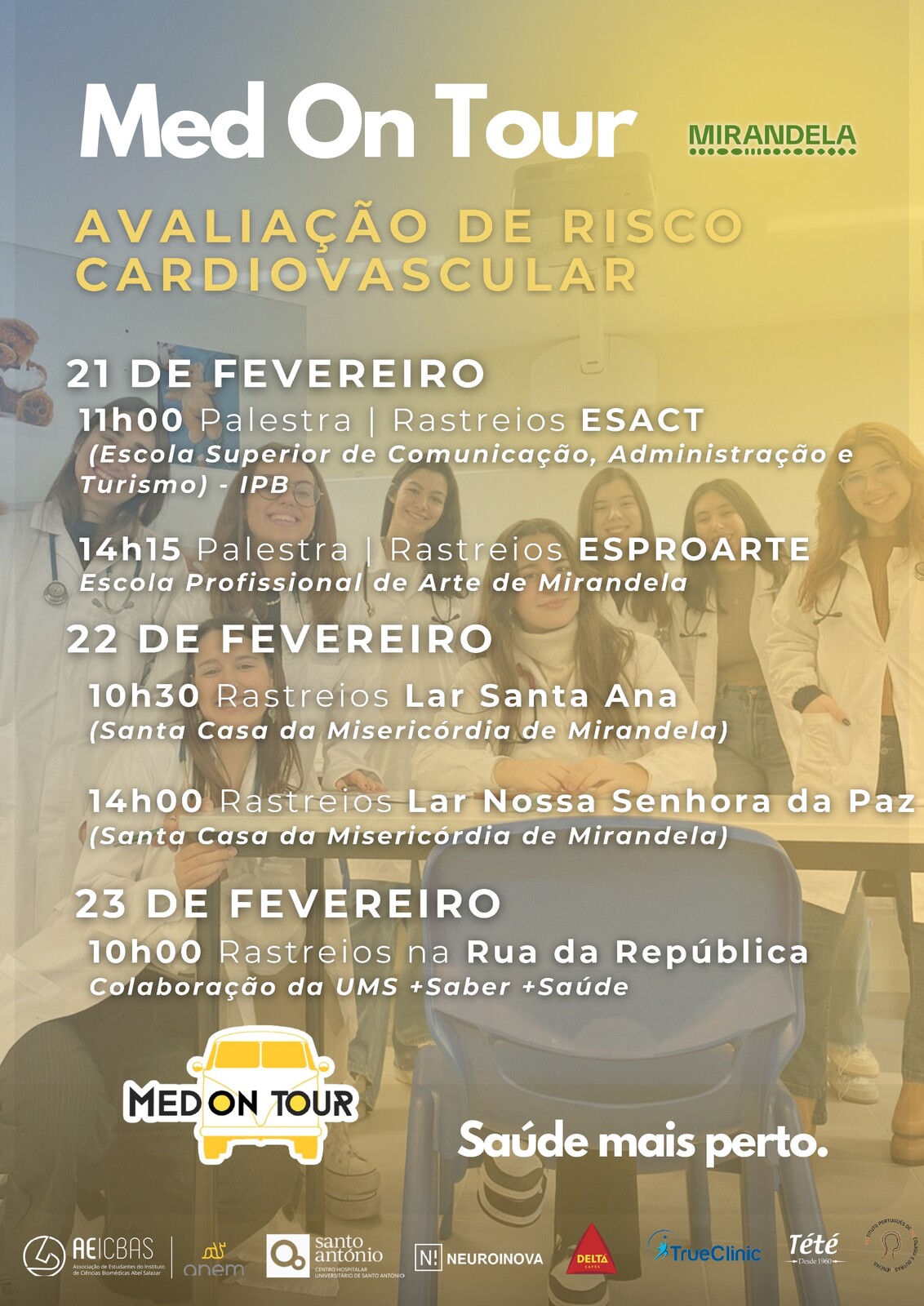 O Med On Tour é a maior ação de rastreios de saúde feita por estudantes de medicina, em Portugal! Mirandela volta a unir-se a esta iniciativa, recebendo estas ações em saúde, do ICBAS (Instituto de Ciências Biomédicas Abel Salazar da Universidade do Porto).