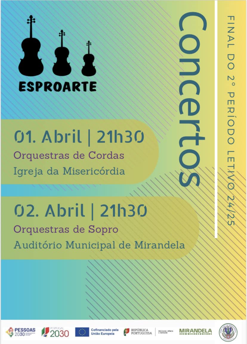 A ESPROARTE convida toda a comunidade a assistir aos Concertos de Final do 2.º Período Letivo, protagonizados pelas suas Orquestras de Cordas e de Sopro.