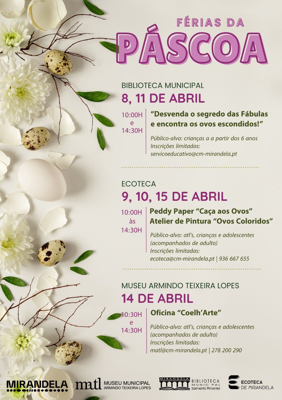 A Páscoa está a chegar e traz consigo uma dose extra de diversão! O Município de Mirandela preparou divertidas atividades para os mais novos, na Biblioteca Municipal, na Ecoteca e no Museu Municipal Armindo Teixeira Lopes.