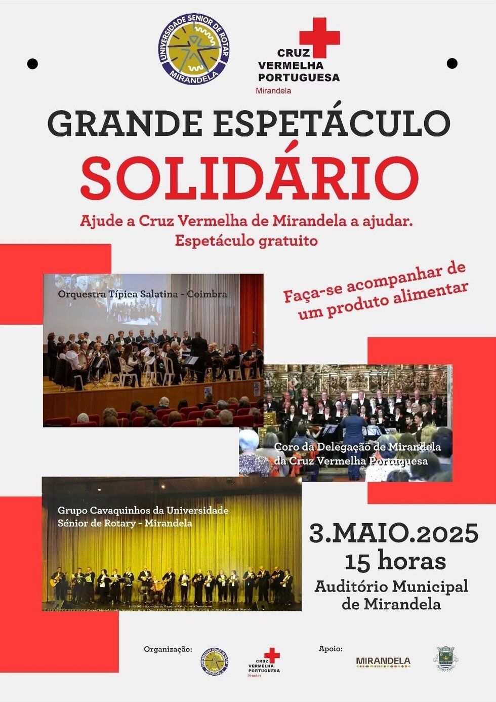 No próximo dia 3 de maio, às 15h00, o Auditório Municipal de Mirandela acolhe o Grande Espetáculo Solidário, numa iniciativa da Universidade Sénior de Rotary de Mirandela e da Delegação de Mirandela da Cruz Vermelha Portuguesa.