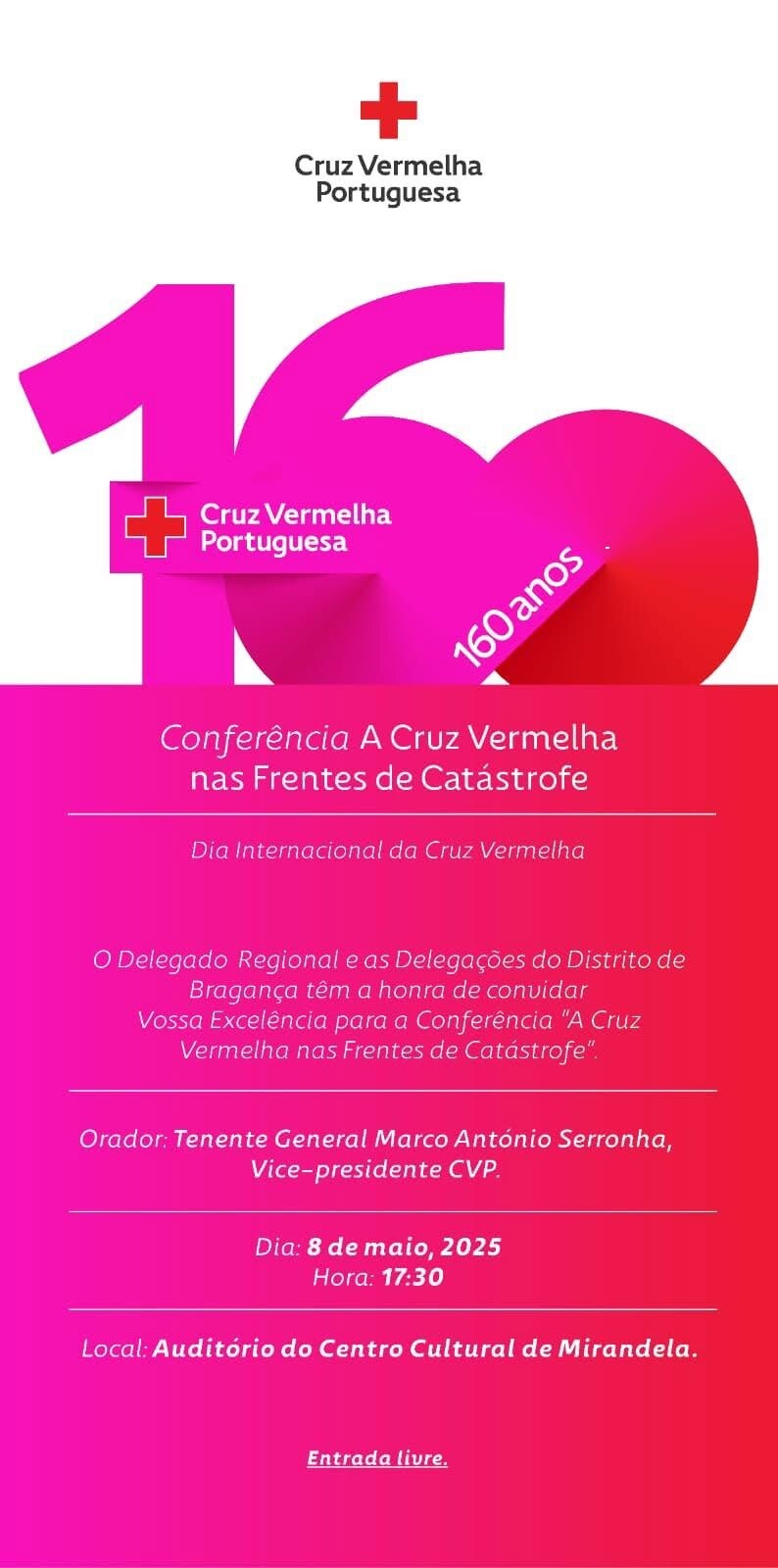 Inserida nas comemorações do Dia Internacional da Cruz Vermelha, terá lugar no dia 8 de maio, às 17h30, no Auditório do Centro Cultural de Mirandela, a conferência "A Cruz Vermelha nas Frentes de Catástrofe".