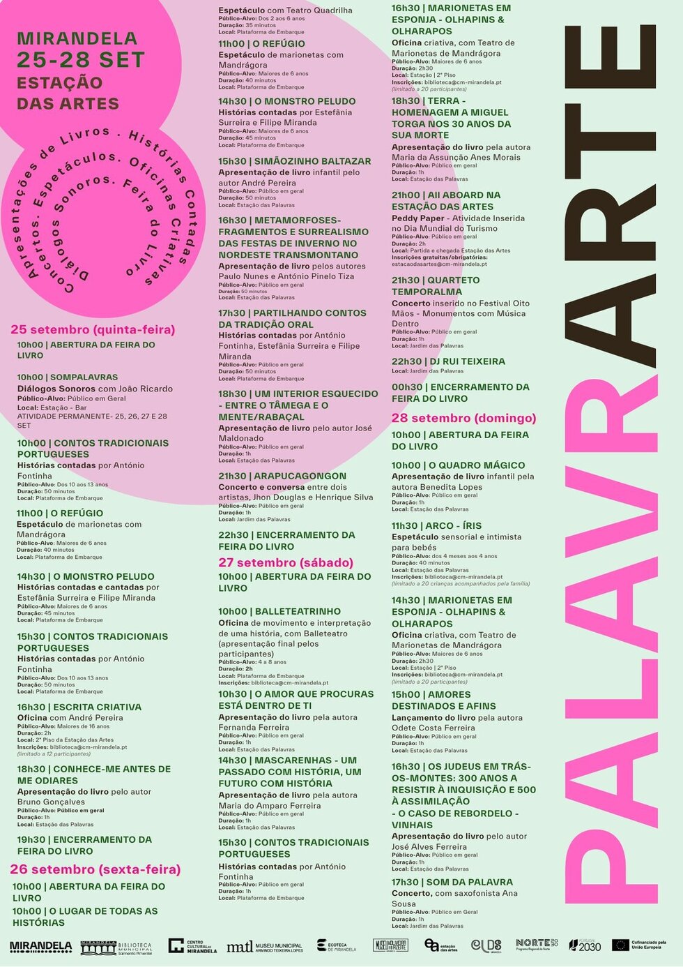 Entre os dias 25 e 28 de setembro, a Estação das Artes de Mirandela transforma-se num ponto de encontro entre a literatura, a oralidade e a expressão artística, com a realização do VI Festival PalavrArte.