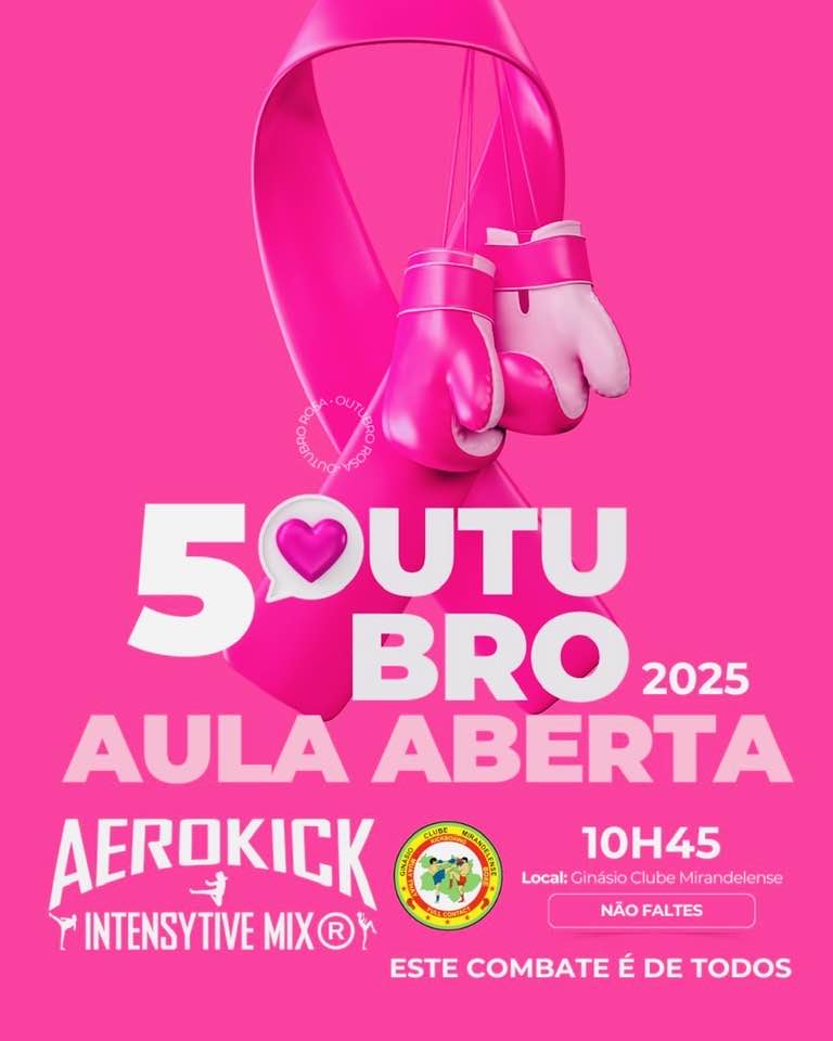 No âmbito da campanha Outubro Rosa, dedicada à sensibilização e prevenção do cancro da mama, vai realizar-se uma Aula Aberta de Aerokick Intensytive Mix®, no dia 5 de outubro de 2025, pelas 10h45, no Ginásio Clube Mirandelense.