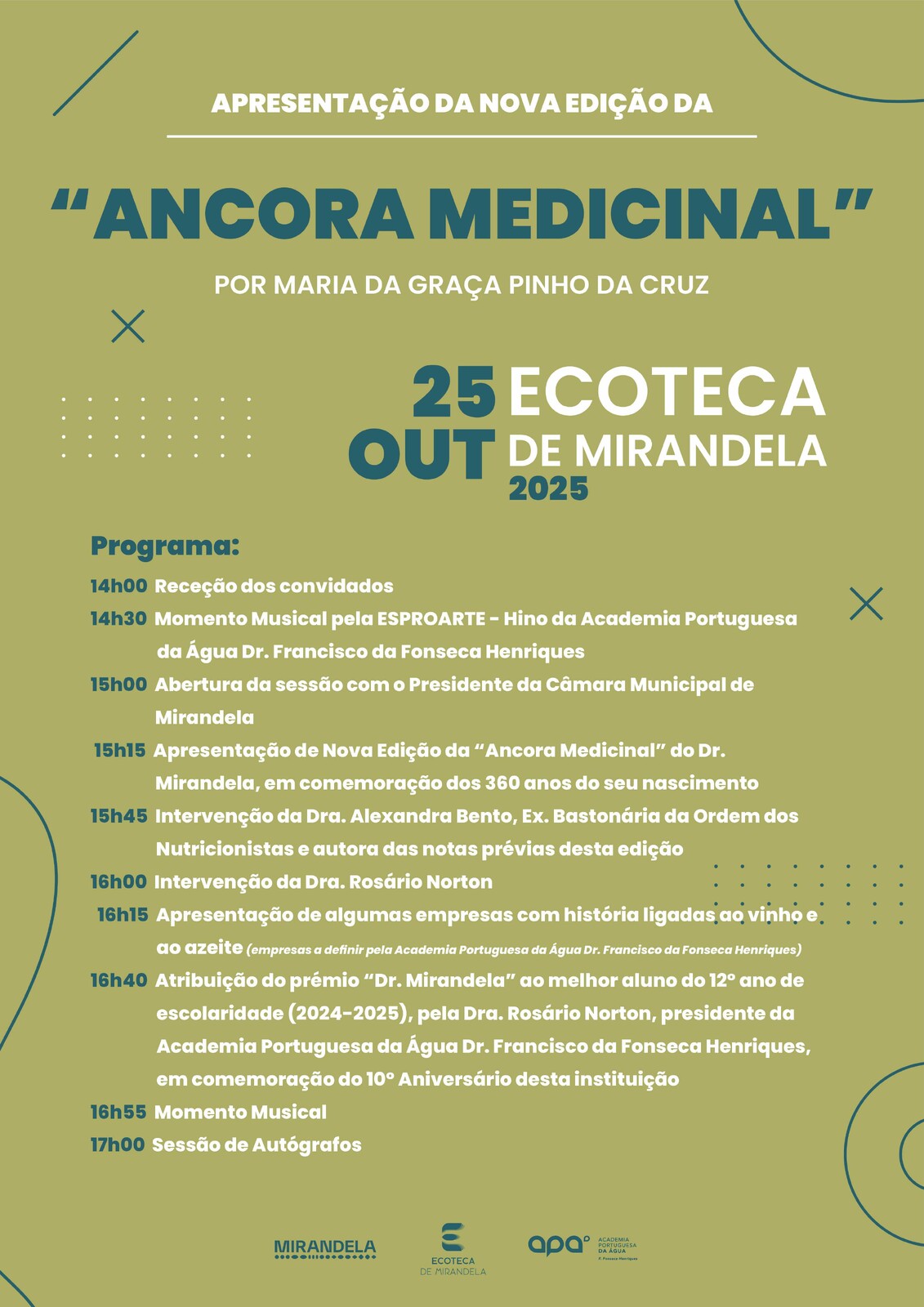 No próximo dia 25 de outubro de 2025, a Ecoteca de Mirandela recebe a apresentação da nova edição da obra Âncora Medicinal, de Francisco da Fonseca Henriques (Dr. Mirandela), numa versão coordenada por Maria da Graça Pinho da Cruz.