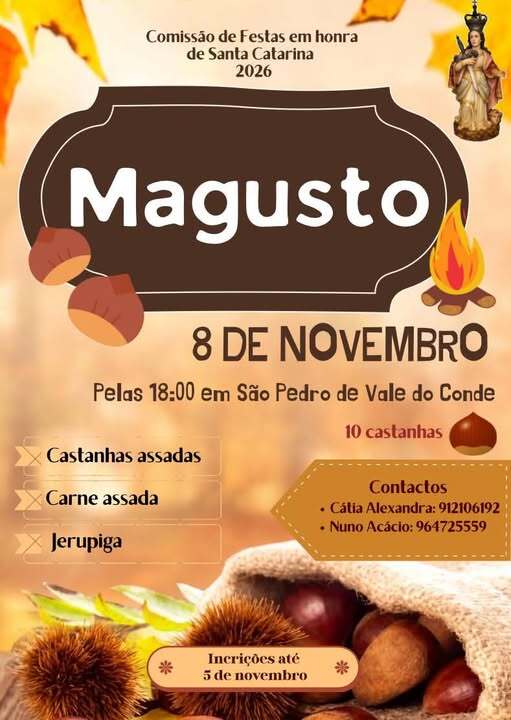 A Comissão de Festas em Honra de Santa Catarina organiza um Magusto em São Pedro de Vale do Conde, dia 8 de novembro, pelas 18h00.
