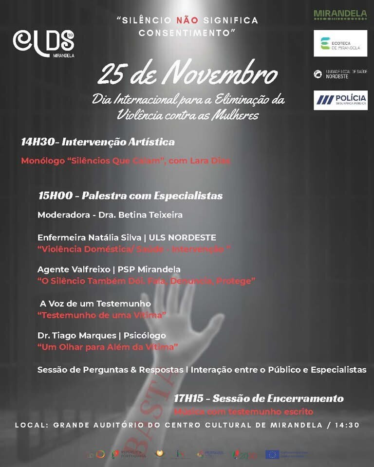 Para assinalar o Dia Internacional para a Eliminação da Violência contra as Mulheres, a CLDS Mirandela organiza, a 25 de novembro, um encontro no Grande Auditório do Centro Cultural de Mirandela.