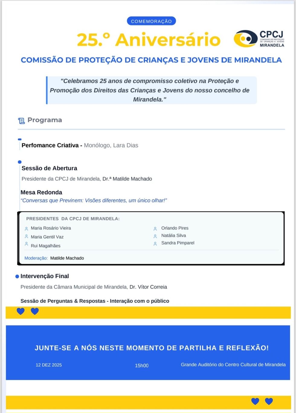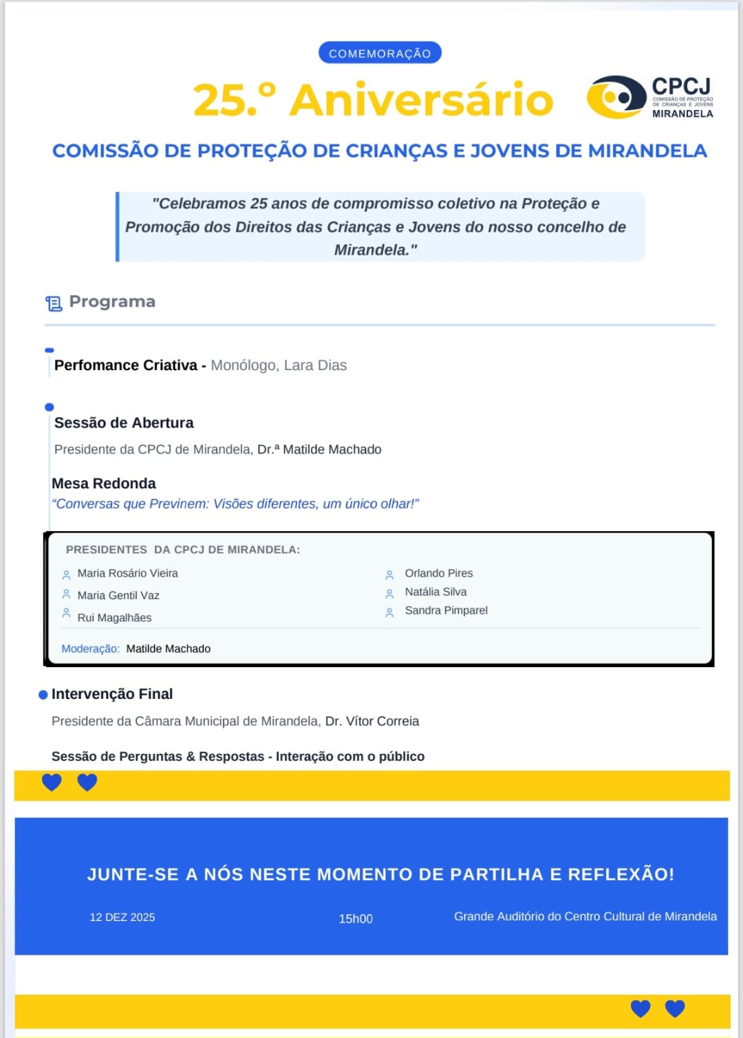 O programa inclui uma Mesa Redonda com antigos Presidentes da CPCJ de Mirandela, onde serão recordados os principais desafios, conquistas e aprendizagens deste percurso. No final, haverá um momento aberto de partilha, convidando todas as entidades e instituições a contribuir com ideias e perspetivas que reforcem o compromisso conjunto na proteção das crianças e jovens.