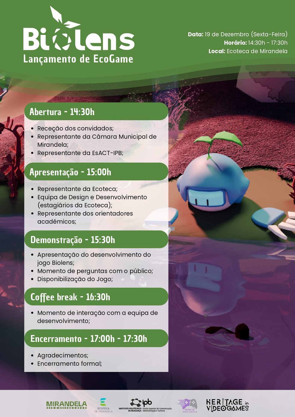 A Ecoteca de Mirandela acolhe, no dia 19 de dezembro, a apresentação do BioLens EcoGame, criado pelos alunos da EsACT‑IPB no âmbito do Projeto Final de Curso para obtenção da licenciatura em Design de Jogos Digitais, que culmina no lançamento oficial do jogo.