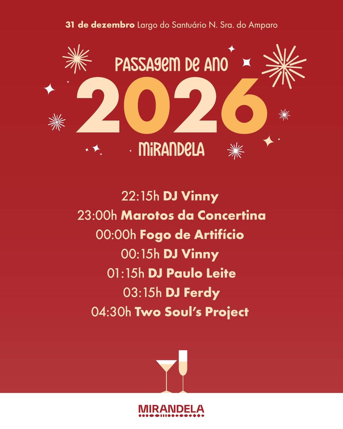 Na noite de 31 de dezembro, o Largo do Santuário de N. Sra. do Amparo recebe uma noite cheia de música e animação, com DJ Vinny, Marotos da Concertina, DJ Paulo Leite, DJ Ferdy e o Two Soul’s Project.