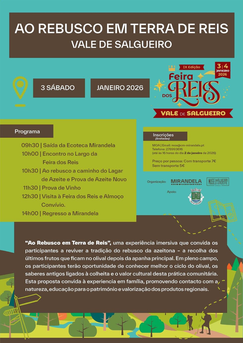 Mais informações e inscrições pelo telefone 278 993 616, através do e-mail moa@cm-mirandela.pt ou presencialmente no Museu da Oliveira e do Azeite (MOA) até às 16h00 do dia 2 de janeiro.