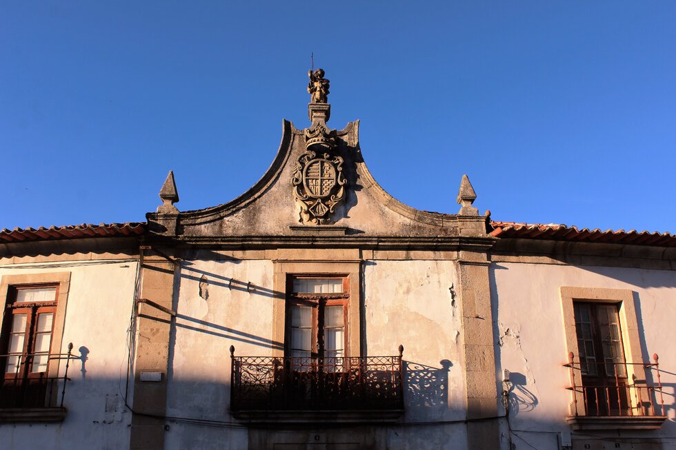 De planta longitudinal, apresenta fachada principal seccionada em três corpos. Ao centro, o eixo formado pela porta e pela janela de sacada, ambas de verga recta, é acentuado pelo brasão de armas dos Condes de Vinhais que faz elevar a linha do telhado e culmina com a imagem em pedra representando o apóstolo São Tiago a cavalo, e empunhando uma lança, vestido de combatente, proveniente da parte superior do arco da Porta de Santiago, uma das três portas que acedia ao interior da muralha de D. Diniz, porta esta que ficava mais ou menos defronte da actual imagem, demolida em 1880, alegando-se então que o estrangulamento da porta dificultava o trânsito a veículos de carga.